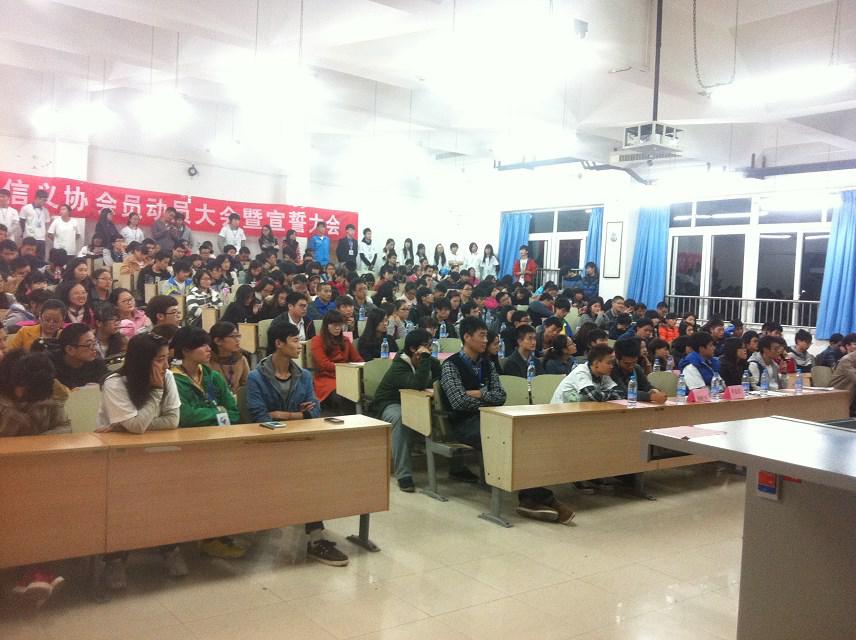 在计信义协成员的辛苦布置下,整个会场整洁、漂亮。随着参加人员陆续到场,大会在主持人的介绍下拉开帷幕。大会中,展示了计信义协近期的爱心志愿活动的记录照以及义协成员的风采。紧接着,由第十一届会长李金龙致辞,言语中,流露出这几年来作为志愿者的骄傲与自豪,同时也借此机会祝愿志愿者能再接再厉为需要帮助的人做力所能及的事。然后,第十二届现任会长谭春龙会长致辞,会长宣布了二十五只志愿服务小分队的成立,同时也欢迎了新的志愿者的加入!大会上班级志愿者王强代表了新进入志愿者行列的同学做了致辞,他发表了对刚刚结束不久的乐一幼儿园爱心活动的感想,呐喊出了志愿者的心声。动员大会当然不会少了宣誓这个环节,在会长唐明棋的带领下,全体起立,人人举起握紧的右拳,大声的宣读了宣誓词,慷慨又激昂。最后,由会长宋东东至闭幕词。