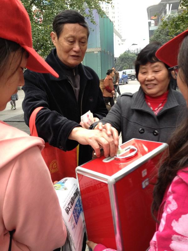 活动前会长将干部干事们分成六组分别在不同的地方进行义卖。活动期间干部干事们纷纷积极地向行走的路人推销报纸,阐述买这些报纸对贫困山区孩子们的重要性。虽然有的干事被拒绝多次,但干事们依旧以微笑去面对每个路人,耐心的向每个经过路人询问是否要献爱心。经过干事干部的不懈努力和广大市民的慷慨解囊,报纸在一份份的减少,爱心却在一点点的累积。相信这些贫困地区的孩子们也会越来越温暖,越来越幸福。