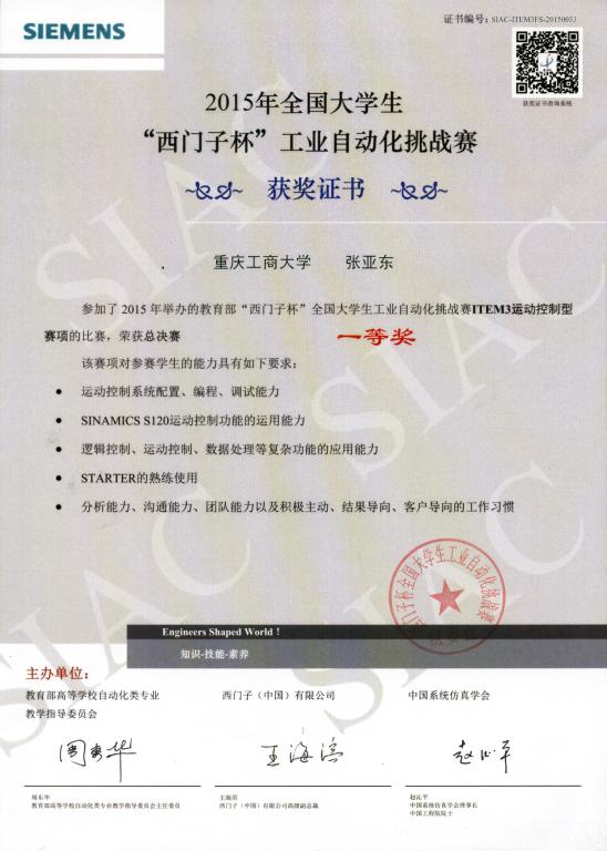 在西门子杯“全国老员工工业自动化挑战赛”中,同学们在四位领队老师晏康、文远熔、刘宵惠、姚行艳的带领下经过激烈角逐获得优异的成绩。其中张亚东、谭绪龙、代芳芬3名同学分别获得全国总决赛一等奖。谢欢、宇小华、邹侨3名同学分别获得全国总决赛二等奖。董小会、孙倩、唐尚华3名同学分别获得全国总决赛三等奖。另外由邹侨、钟泰、赵芮、余小华、谢欢、王泽锫、孙倩、马瑞鑫、江虹、张亚东、张贤东、张攀、杨林、唐尚华、谭绪龙、董小会、代芳芬、陈春宏、谢成德、谭文俊组成的参赛队伍中获得9个赛区一等奖,9个赛区二等奖,2个赛区三等奖。