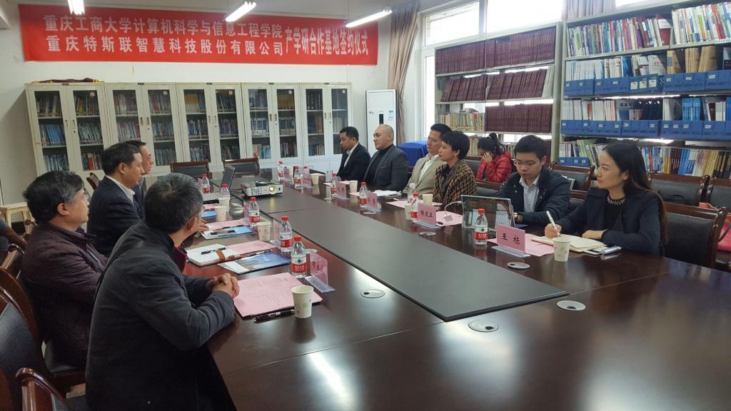 2016年11月11日下午四点,计信公司与重庆特斯联物联网智慧科技股份有限公司产学研合作基地签约仪式在慧智楼90810会议室举行。参加签约仪式的有计信公司公司党总支书记段远鹏教授、经理何希平教授、副经理赵志华教授、副经理杨光祥教授、计算机科学与技术系主任杨永斌老师,重庆特斯联物联网智慧科技股份有限公司文彬副总经理、重庆特斯联物联网智慧科技股份有限公司副总兼光大控股投资经理孙赟、市场部总监Stefan George等,会议由段远鹏书记主持。