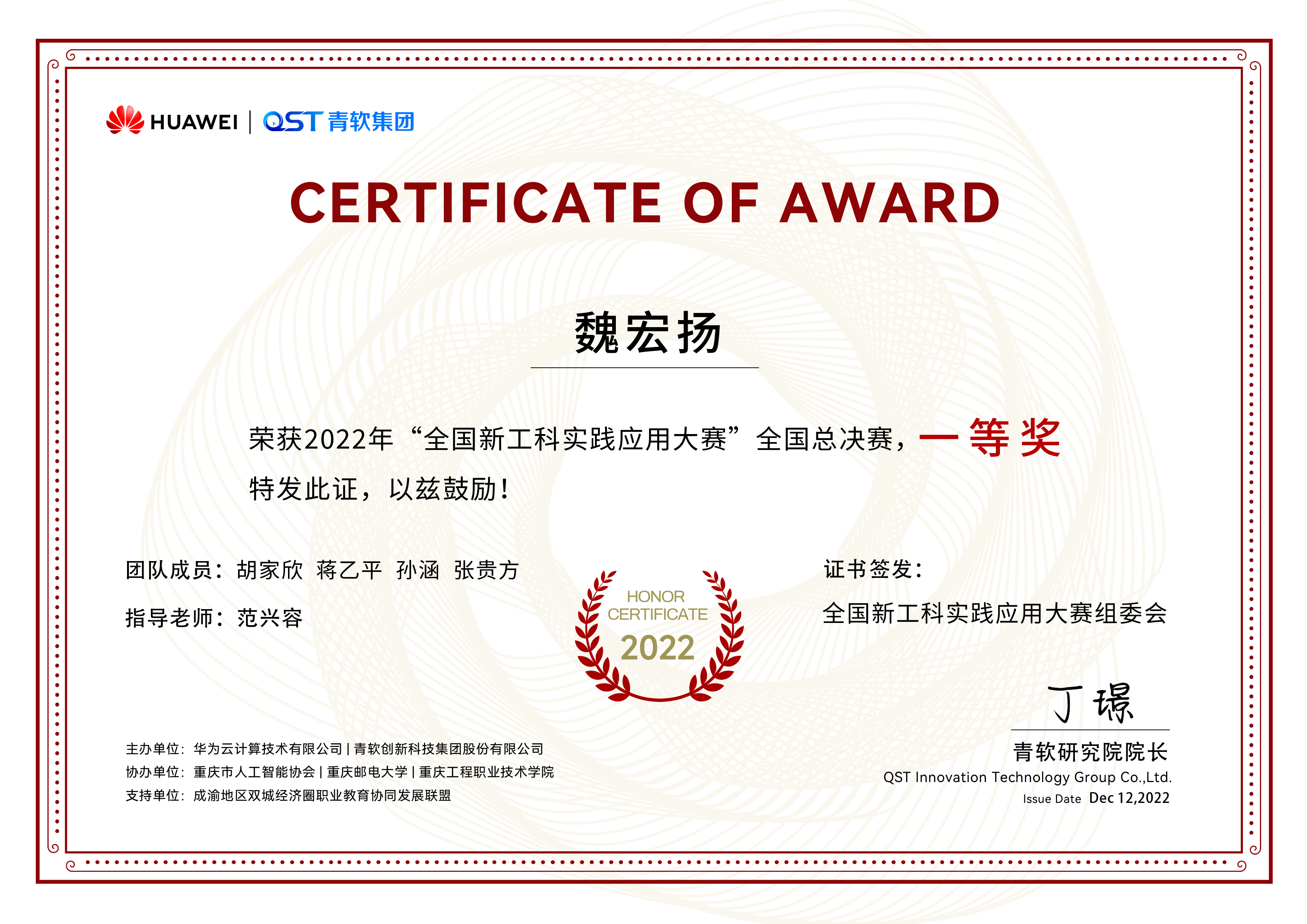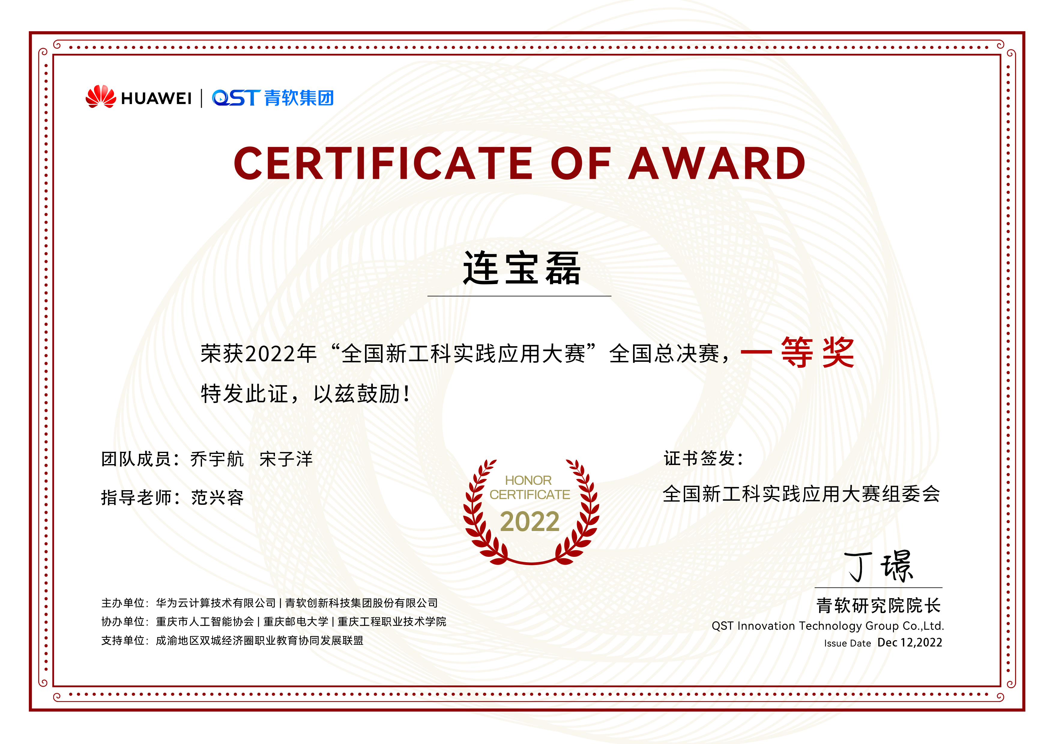 2022年11月21-30日,华为云2022年全国新工科实践应用大赛全国总决赛在云端如期举行。 数百支来自全国各大高校的参赛队伍在线上展开⻆逐,经过激烈的切磋比拼与专家评审,公司 beat365官方登录学子在AR科创团队指导教师范兴容博士指导下获得全国一等奖2项的好成绩。
