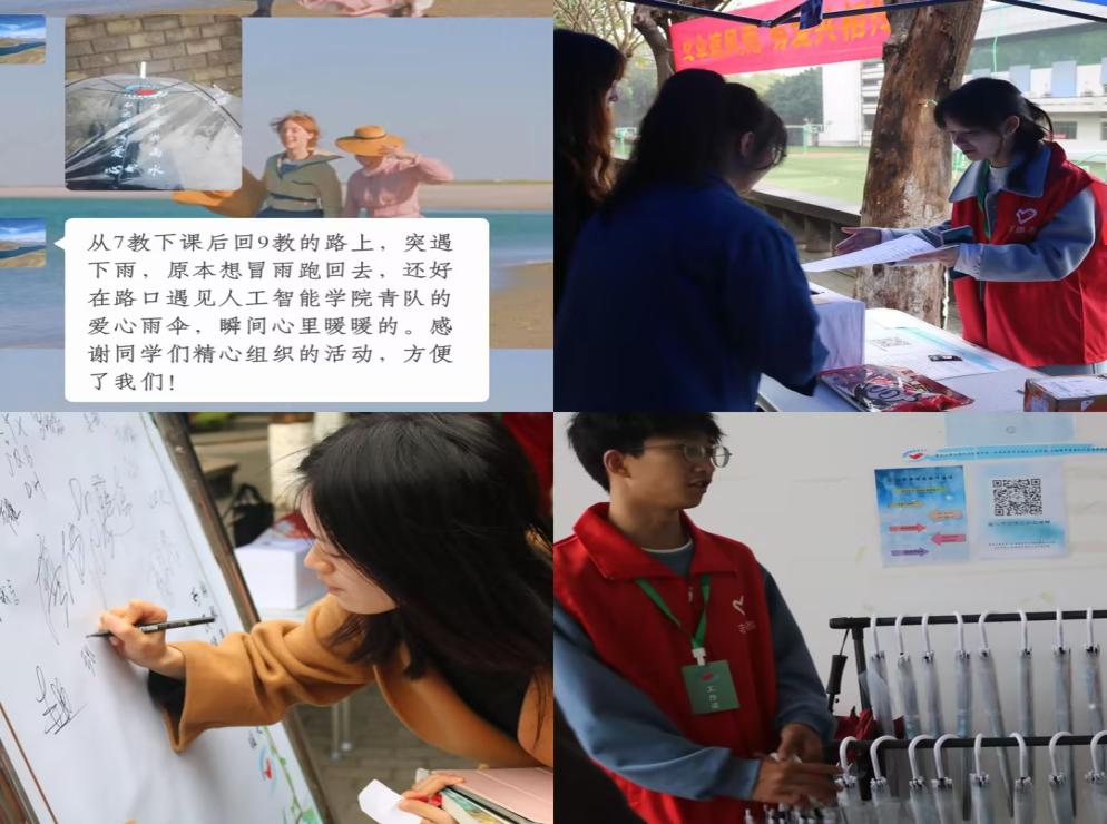 “爱心雨伞”活动的开展,引起了师生的积极反响。“从七教下课后回九教的路上,突遇下雨,原本想冒雨跑回去,还好在路口遇见beat365官方登录青队的爱心雨伞,瞬间心里暖暖的。感谢同学们精心组织的活动,方便了我们!”这是来自一位教师的反馈。同时也有员工表示:“早上上课时天气晴朗,中午下课后便阴雨绵绵,七教和九教门口的爱心雨伞为我们解了燃眉之急。”