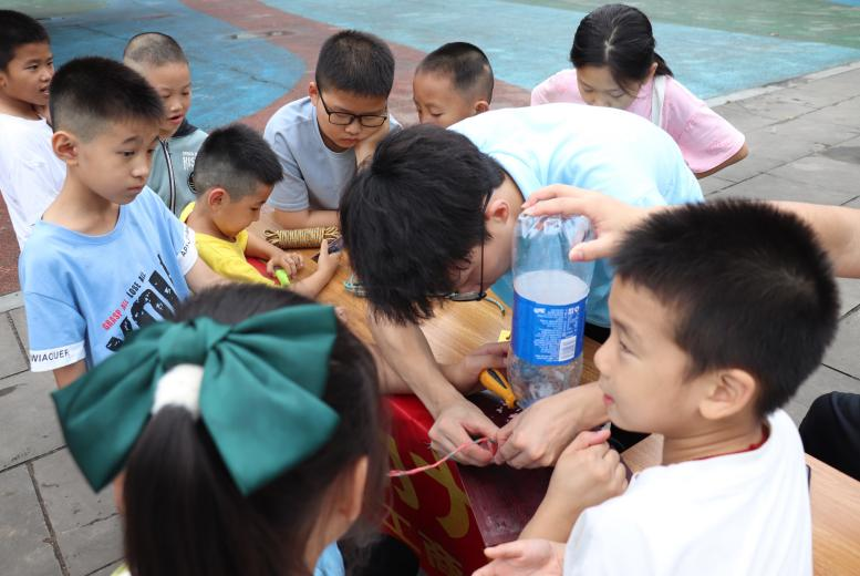在科技展示环节,队员们演示了“水火箭”科普小实验。通过讲解气压的产生和力学相关知识,演示“水火箭”的发射过程,让孩子们更直观的了解导弹、运载火箭的发射升空和回收过程。队员们还带领小朋友们现场体验制作“水火箭”,通过切身体验,培养科学用脑、科学动手的学习习惯和掌握独立思考、勤于实践的学习方法。哥哥姐姐们的课堂十分有趣,不仅让孩子们看到了神奇的物理现象,也学习到了以前不知道的新知识。