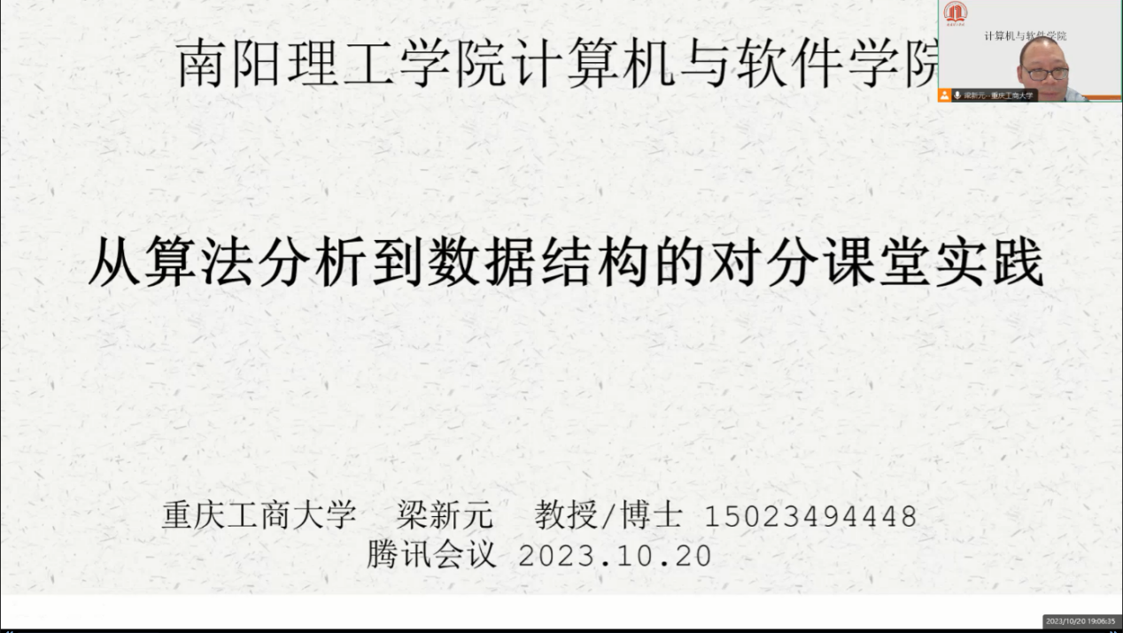 应南阳理工公司计算机与软件公司邀请,2023年10月20日晚上,beat365官方登录梁新元教授为公司教师做了《从算法分析到数据结构的对分课堂实践》的主题报告,郑珂副经理及公司10余位教师参加,唐立老师主持会议。