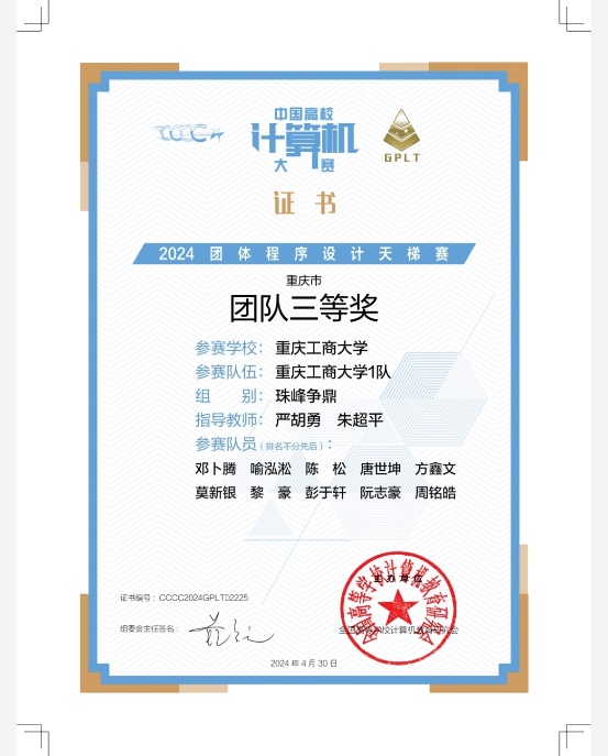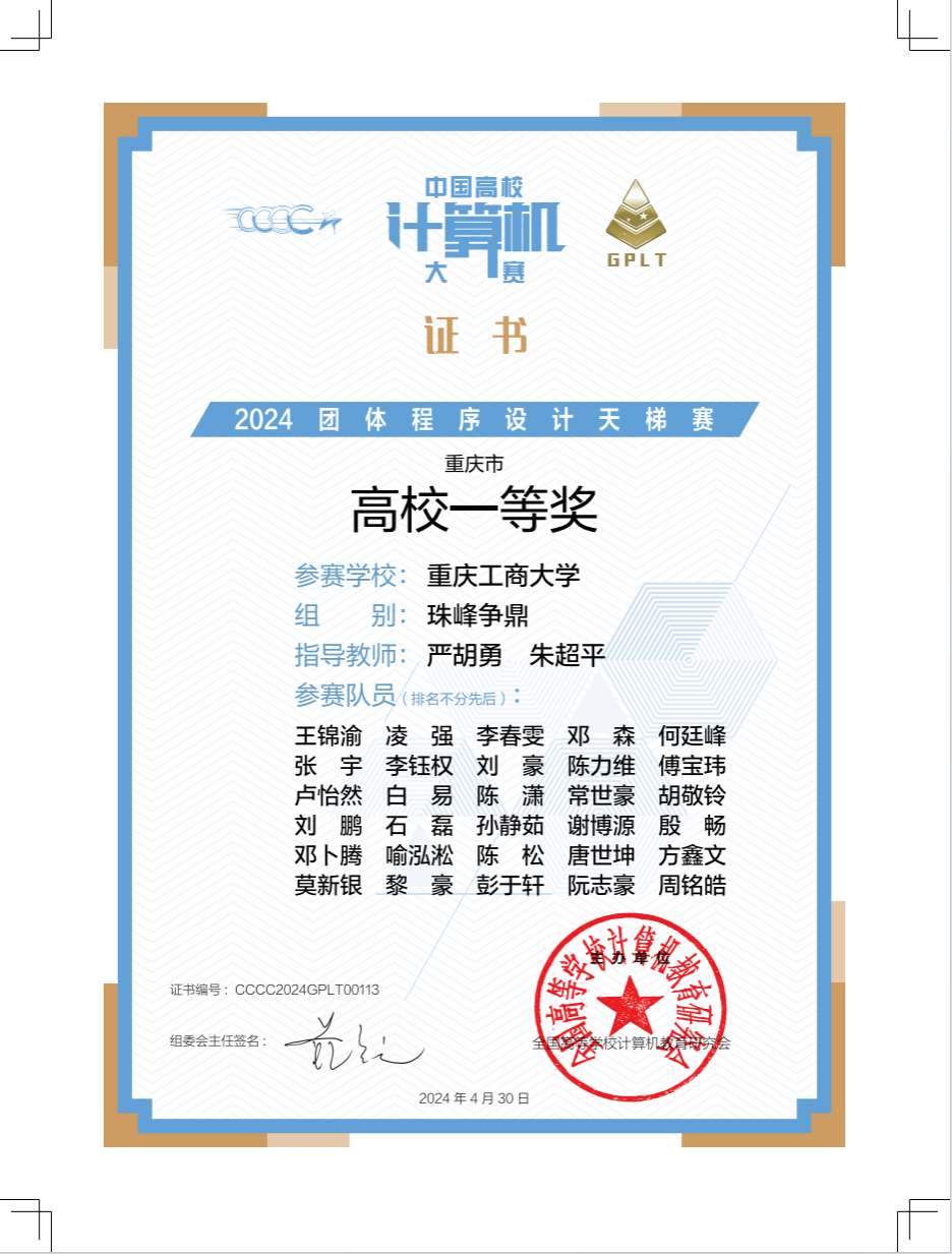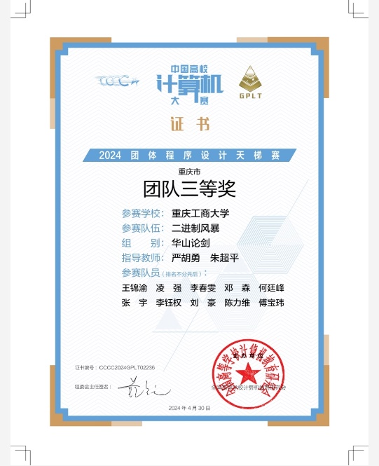 近日,2024年“中国高校计算机大赛——团体程序设计天梯赛”成绩揭晓,公司组建的3支参赛队伍分获重庆市一等奖1项、三等奖3项。其中严胡勇、朱超平指导的团队荣获“珠峰争鼎”组重庆市高校一等奖,“AC,启动”团队在“华山论剑”组获重庆市团队三等奖,“二进制风暴”团队在“华山论剑”组获重庆市团队三等奖,“beat365官方登录1队”团队在“珠峰争鼎”组获重庆市团队三等奖。
