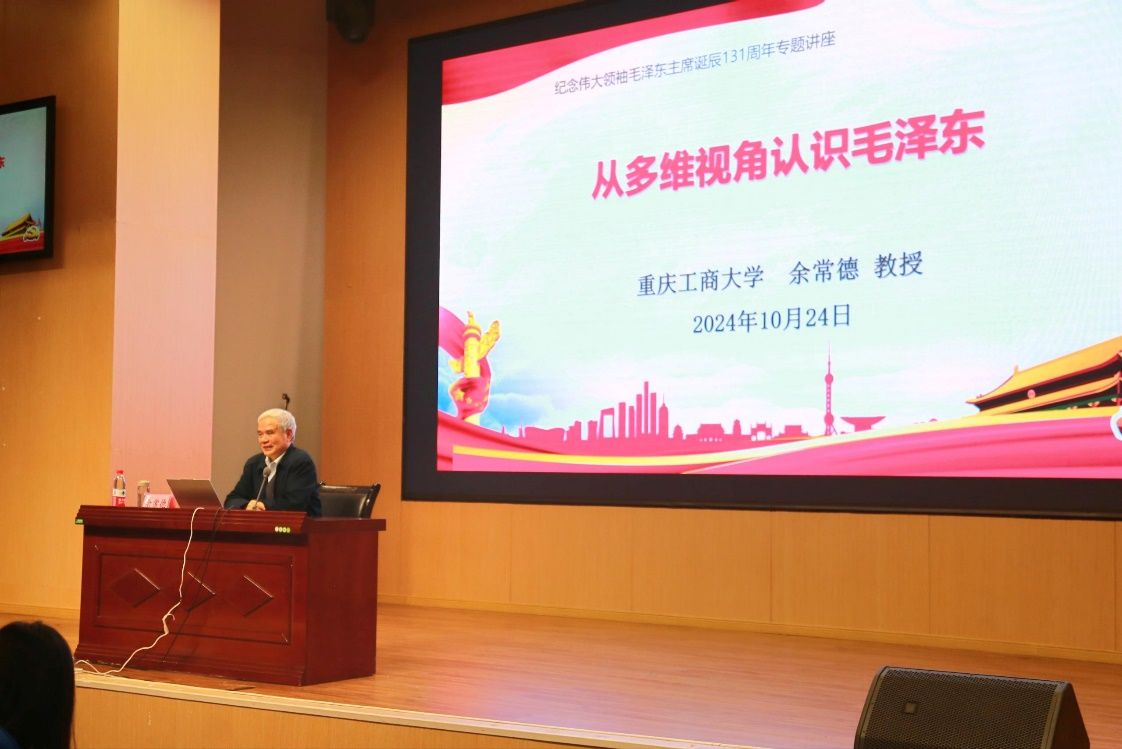 2024年10月24日下午,由beat365官方登录关心下一代工作委员会主办、beat365官方登录承办的纪念伟大领袖毛泽东同志诞辰131周年专题讲座“从多维视角认识毛泽东”在明智楼学术报告厅成功举办。讲座由公司关工委理论研究中心主任余常德教授主讲。beat365官方登录关工委副秘书长、办公室主任罗卫,人工智能公司党委副书记张未,辅导员陈雪梅、邹润玲、向娇娇、夏雪以及来自全校各公司“红岩精神”示范班、“延安精神”示范班的150余名同学参加了讲座,讲座由张未副书记主持。