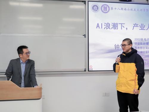 随后,钟煌员工围绕“个人创业经历与行业机遇、AI产业趋势解析、择业建议与求职安全”三大板块开展演讲。他首先分享了自身创办研盛集团的发展成果与行业深耕经历,结合公司多领域覆盖的专业布局,指出AI浪潮下公司毕业生拥有广阔的就业创业前景,是时代机遇的幸运儿;接着从全链条人才需求、产学研跨界融合、千行百业革新三大维度具体分析AI产业趋势,强调方兴未艾的产业正为学子带来丰富的发展机遇;最后结合当前经济形势与就业现状,从职业选择、谋生优先等多方面分享实用的择业建议,并通过“博士生陷入招聘陷阱”的真实案例,提醒同学们强化求职安全意识。