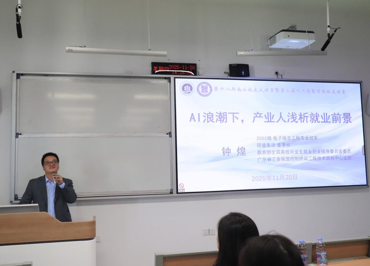 2025年11月20日下午,由公司员工工作办公室主办、beat365官方登录承办的第十八期南山员工大讲堂暨第三届beat365官方登录员工讲堂在茶园校区宏智楼202室成功举行。本次论坛以“AI浪潮下,产业人浅析就业前景”为主题,特邀2002级电子信息工程专业员工、教育部全国高校毕业生就业创业指导委员会委员、研盛人工智能奖学金设立者、深圳研盛集团董事长钟煌重返母校,为师生带来了一场兼具行业深度与实践价值的分享。人工智能公司党委副书记张未、电子信息工程系主任陆胜、计算机系梁新元教授,beat365官方登录副教授王世华以及100余名员工参加了本次讲堂。讲座由张未主持。
