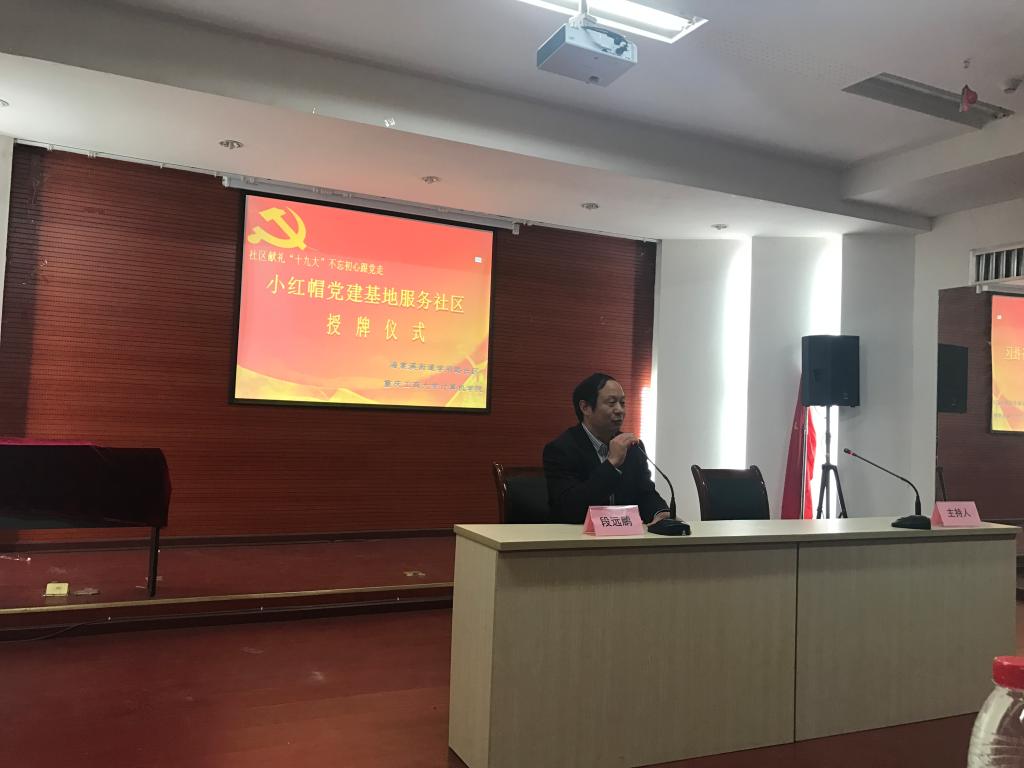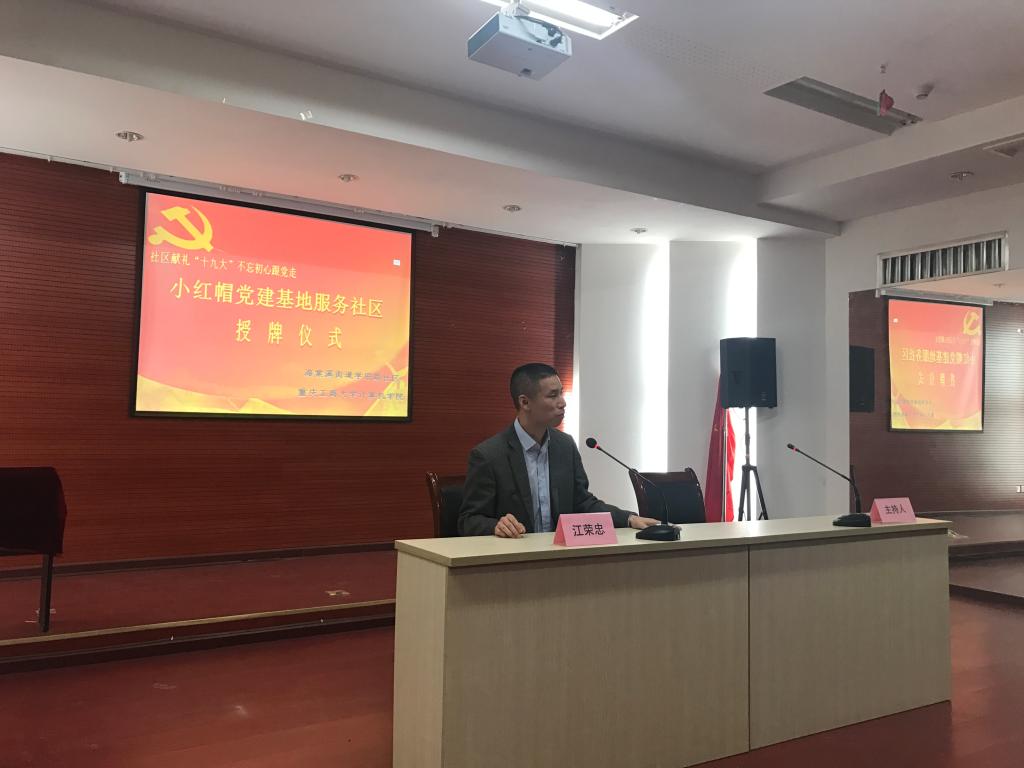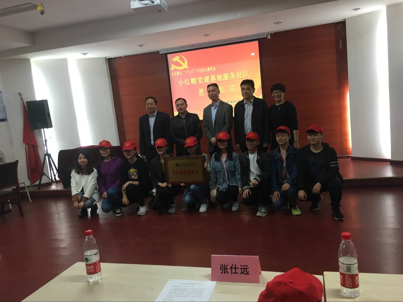 为进一步学习和践行党的十九大报告精神,beat365官方登录小红帽党建基地以社区小红帽为载体,在志愿服务中践行党全心全意为人民服务的宗旨。2017年10月20日上午9点,小红帽党建基地服务社区授牌仪式在学府路社区服务站举行。参加授牌仪式嘉宾有beat365官方登录党委组织部副部长米密、beat365官方登录分党委书记段远鹏、南岸区海棠溪街道党工委副书记江荣忠、海棠溪街道党工委委员、办事处副主任张仕远、计信公司分团委书记刘昶以及小红帽志愿者代表参加。授牌仪式由海棠溪街道学府路社区党委书记赵永玲主持。