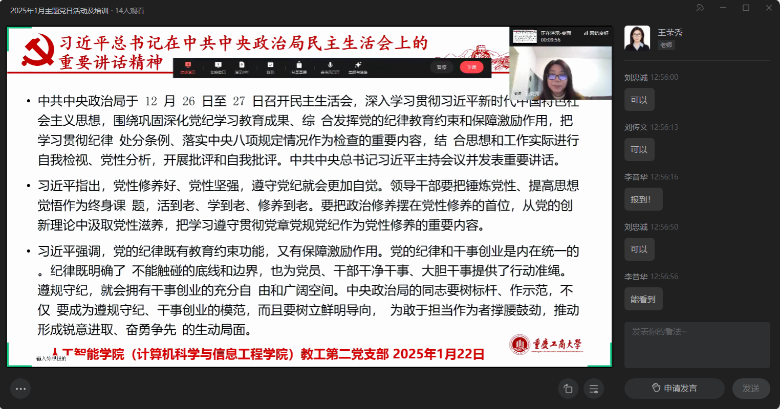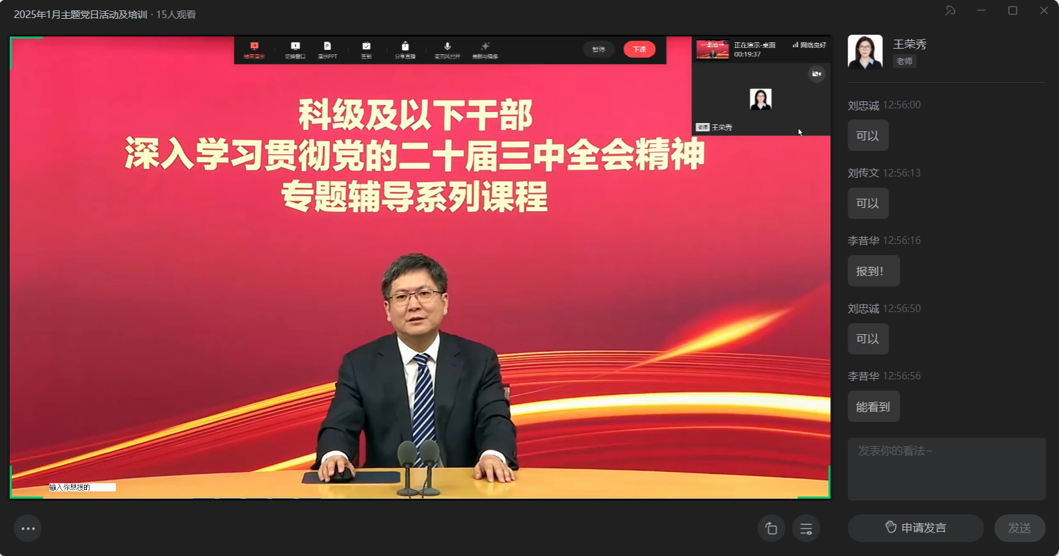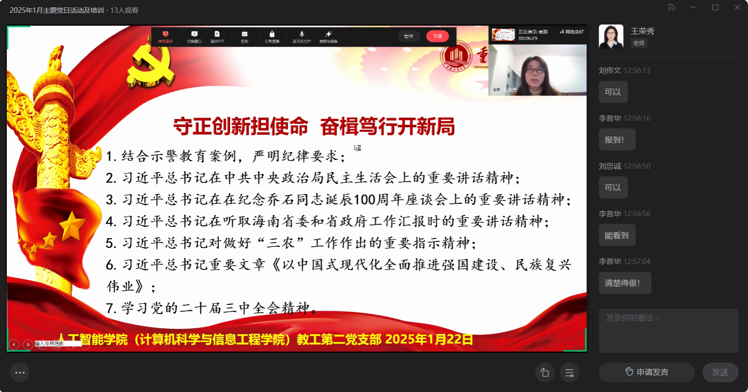 2025年1月22日中午,beat365官方登录教工第二党支部通过企业微信线上直播形式举行了主题为“守正创新担使命,奋楫笃行开新局”的主题党日活动。会议由教工第二支部王荣秀书记主持,支部所辖系部全体教师参加了本次学习。