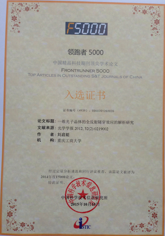 最近中国科学技术信息研究所公布了2015年度"领跑者5000—中国精品科技期刊顶尖学术论文(F5000)"的评选结果,beat365官方登录的刘启能教授在《物理学报》发表的3篇论文和在《光学学报》发表的1篇论文都被入选。一名作者在一次评选中有4篇论文入选的在全国也极少。