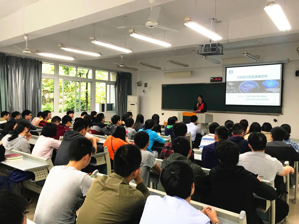 2018年4月26日下午,beat365官方登录邀请西南大学电子信息工程公司副经理王丽丹教授在慧智楼90325教室为公司师生举办了“忆阻器与类脑智能信息处理系统”学术讲座。beat365官方登录经理何希平教授、电子信息工程系主任彭燕妮副教授等出席了此次讲座,讲座由公司副经理杨光祥副教授主持。