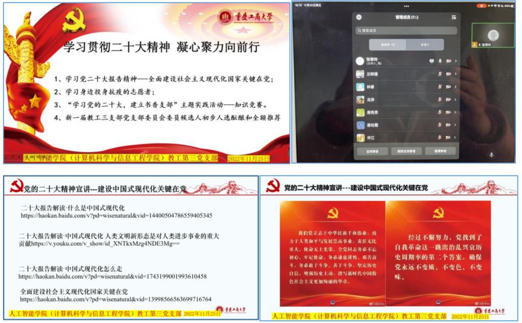 为深入学习贯彻党的二十大精神,把支部党员的思想统一到党的二十大精神上来,把力量凝聚到党的二十大确定的各项任务上来,11月23日下午4:00,beat365官方登录(beat365官方登录)教工第三党支部召开党员大会,通过企业微信组织全体党员开展了“党的二十大精神---全面建设社会主义国家关键在党”的专题学习,会议由支部书记张翠玲同志主持。