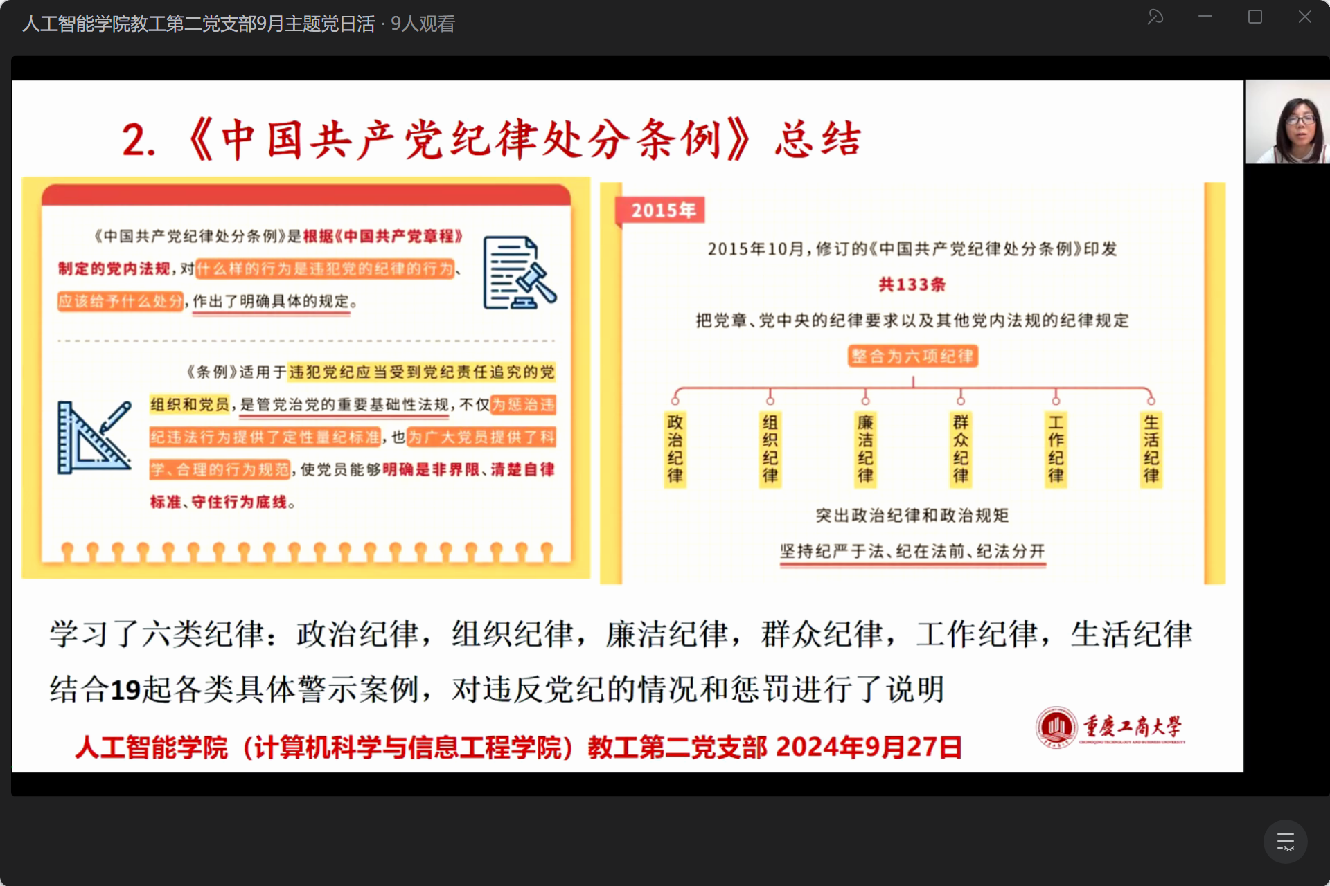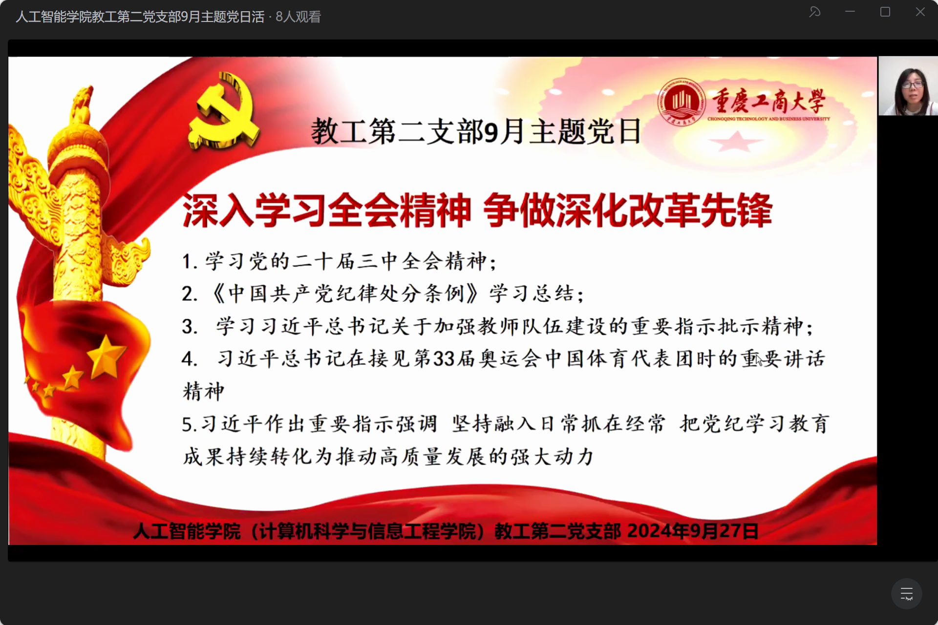9月27日午间,beat365官方登录教工第二党支部通过企业微信直播形式举行了主题党日活动。此次活动由支部书记王荣秀老师主持,旨在深入学习贯彻中国共产党二十届三中全会精神,对4-7月的党纪学习教育进行复盘总结,进一步推动高质量发展。