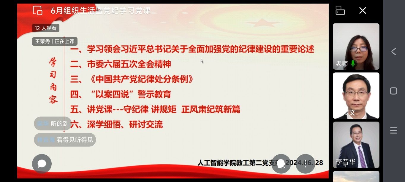 2024年6月28日,正值午后,企业微信线上直播室里,公司教工二支部全体党员齐聚一堂,共同开展了本月的党组织生活活动。本次活动的重点是学习习总书记关于全面加强党的纪律建设的重要论述,领会重庆市委六届五次全会精神以及巩固中共党纪处分条例。