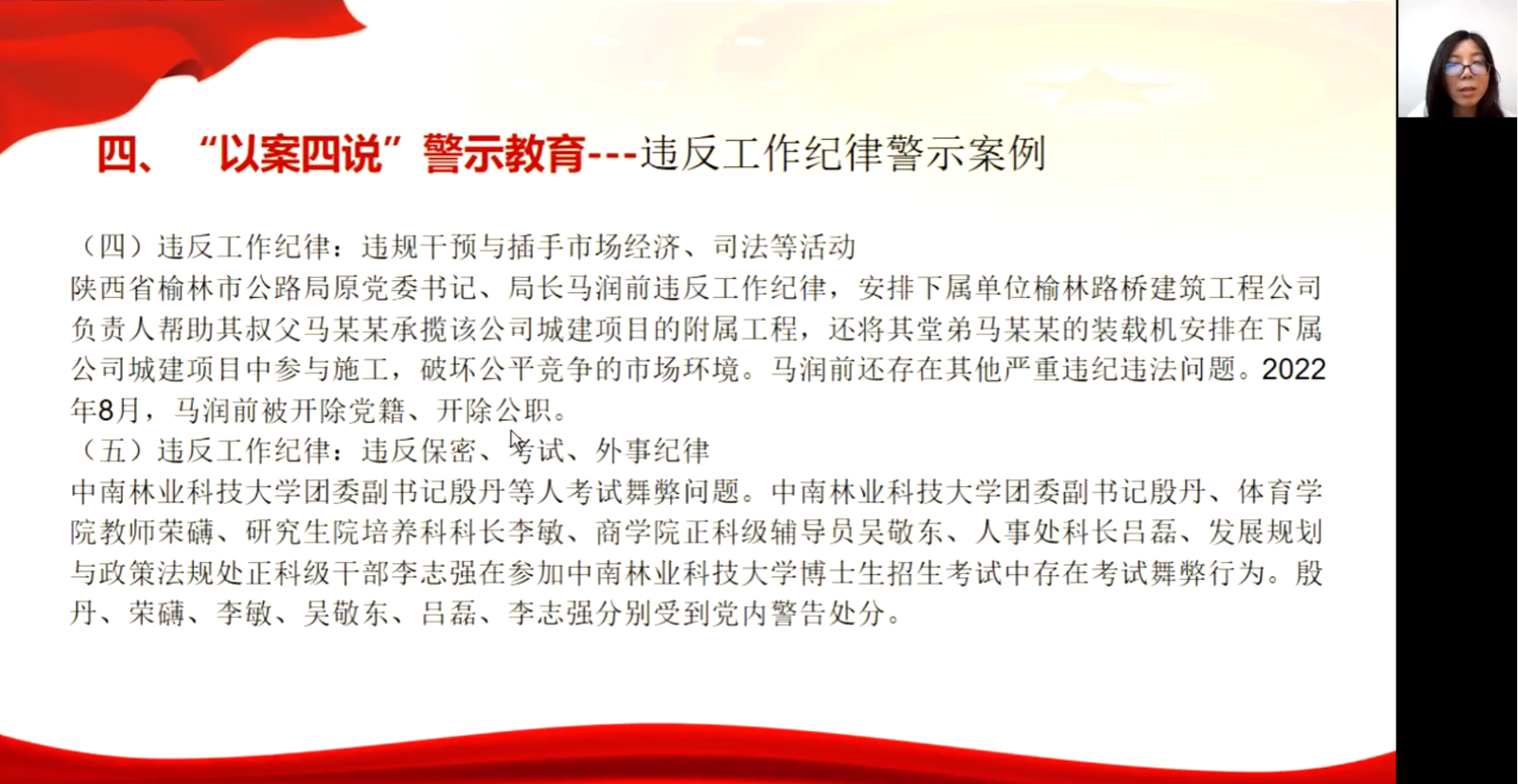 会议中,王荣秀书记深情回顾了习总书记的指示精神,并结合实际案例进行了生动的“以案四说”警示教育。她强调:“作为高校教师,我们要时刻牢记党员的使命和责任,严格遵守党的纪律,带头遵守社会公德,树立良好的师德师风。”