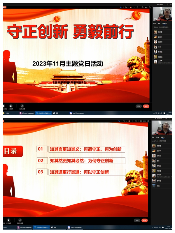 2023年11月24日中共人工智能公司党委教工第二支部在企业微信以线上会议的方式开展“守正创新 勇毅前行”主题党日活动,本次活动由支部书记李明同志主持。